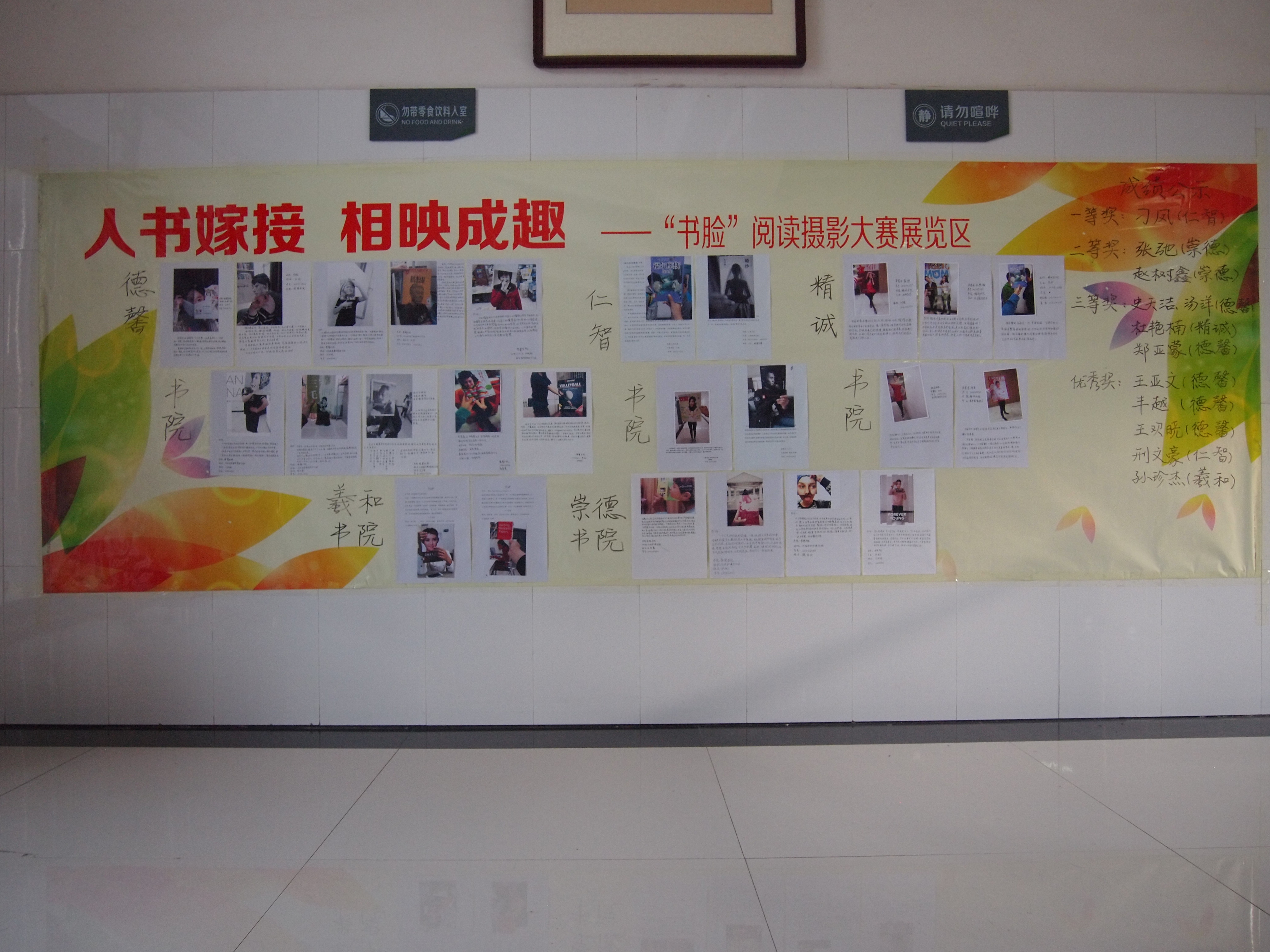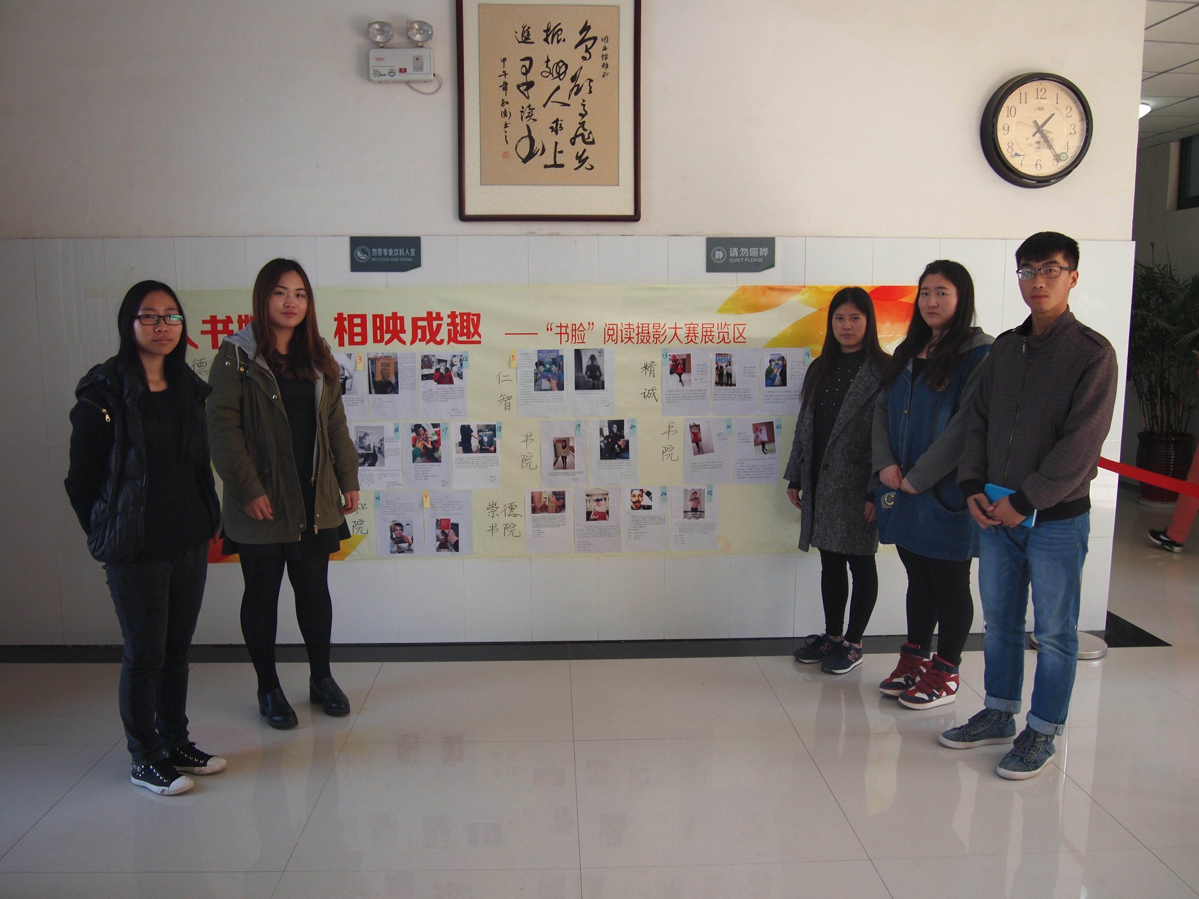 新乡医学院三全学院第四届读书月系列活动之“人书嫁接,相映成趣”——“书脸”阅读摄影大赛于10月16号至11月1号期间在新乡校区和平原校区同时举行,该活动是由我校图书馆、学生事务发展部主办,校学生会承办,各书院联合举办。 活动期间,学生们积极参与,热情度极高,在图书馆和校园内时常能看到学生们拍摄“书脸”照片的身影。图书馆也收到多幅作品,并将优秀作品在图书馆内展览。根据大赛评审标准,各书院负责人和图书馆老师一起,从展览的优秀作品中评选出一、二、三等奖和优秀奖,并将成绩公示于展览墙上。 创意的摄影方式激发了学生们的阅读兴趣,独到的书评见解促进了读者之间的好书信息共享。该活动还在一定程度上达到了繁荣校园文化、彰显人文关怀和精神风貌的目的,并且丰富了师生们的课余生活,提升了校园文化品位,具有实际意义。 各书院负责人与展览墙合影: