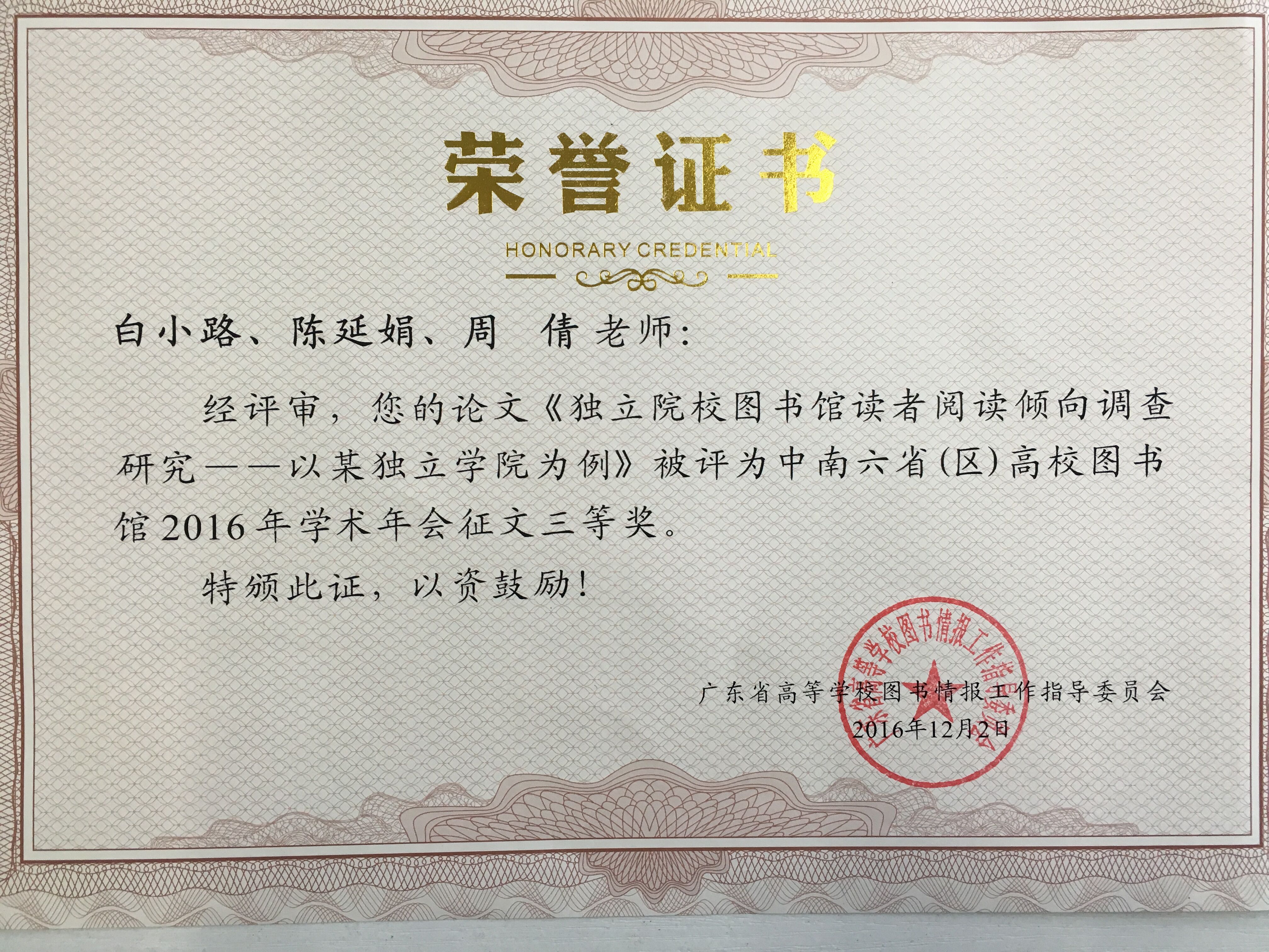 中南六省(区)高校图书馆2016年学术年会于2016年11月20号-12月2号在广东韶关市召开,六省(区)176所高校图书馆共有440余优秀论文获奖作者受邀参加了本次会议。本届年会以“互联网+时代的高校图书馆建设与发展”为主题,会议共收到投稿论文144篇,我校白小路、陈延娟、周倩合作撰写的“独立高校图书馆读者阅读倾向调查研究”论文被评为“优秀论文”三等奖,是本届年会65篇获奖论文中极少数几个独立院校图书馆之一,也是河南省3篇获奖论文之一。 我校图书馆本届获奖论文是图书馆第二篇获得“中南六省(区)高校图书馆学术年会”优秀论文奖。说明我校图书馆馆员能够利用图书馆专业知识,结合图书馆工作实际,能积极探索独立院校特殊教育条件下的现代图书馆读者服务理念和方法,促进独立院校图书馆服务水平的提升。