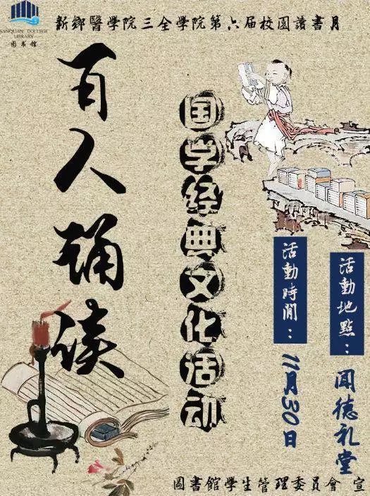 最是书香能致远,腹有诗书气自华。在一个个活动悄悄落下帷幕的同时,我们的读书月活动也来到了尾声,最后一场富有传承意义的比赛在个各书院之间拉开了帷幕。 日落于心,词风悠然。每当夜幕降临之后,总会有朗朗诵读之声伴随着夜晚的瑟瑟秋风在三全校园中回荡,各个书院的百人诵读队伍都在紧锣密鼓地排练着,从阵型、形式等多个方面都进行了数次改动,就是为了在闭幕式的百人诵读中能够一展风采,让三全师生能够感受到那股弥漫在校园中的芬芳书香。 国学经典,这一用之不尽,取之不竭的智慧之源如云飘逸、如柳柔细、如水清澈、如友相伴,在各个书院的朗诵之中更是表现得淋漓尽致。诗词本无生命,一如曹操的《短歌行》中所说:但为君故,沉吟至今。我们就是这些国学经典的传承人,而百人诵读就是一场传承的盛宴,五大书院的队伍齐聚闻徳礼堂作为传承的交接者,让国学经典在我们之间口口相传,让我们回想起那些被暂时遗忘的诗词,让诗词之风永远飘荡在我们的校园之中。 报名时间:2017年11月27日晚上八点 报名方式:微信公众号馆学长微咖 活动时间:11月30日 活动地点:闻德礼堂 百人诵读,不仅仅是一场比赛,它更是一场传承的盛宴,而这场盛宴欢迎每一个人的到来。