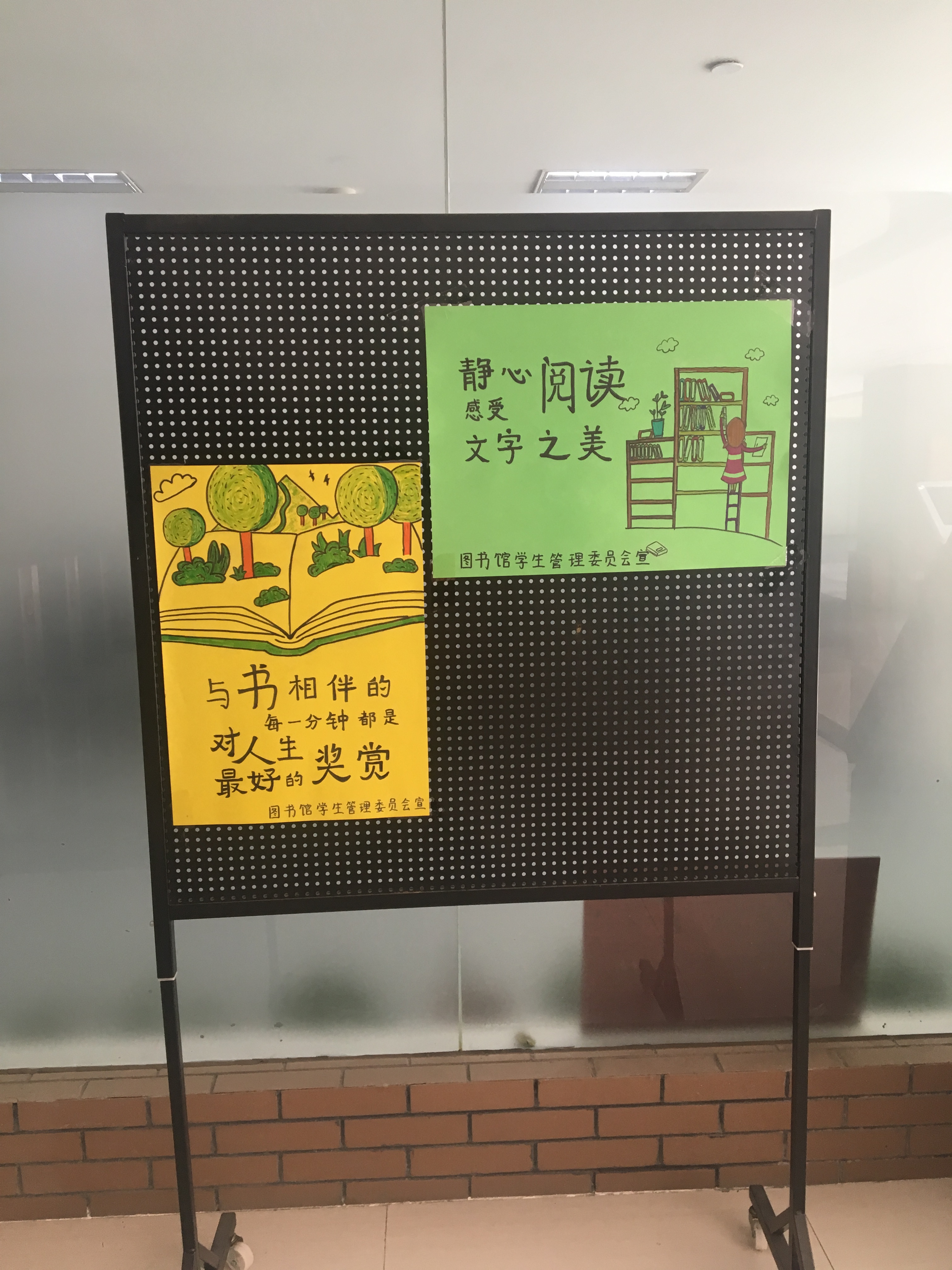 活动期间,图书馆设计制作了大型读书日喷绘,制作了宣传视频,馆内多处设置手绘海报、画板,宣传“4.23世界读书日”的有关知识,并在服务台设置志愿者咨询服务台,方便师生咨询活动内容。