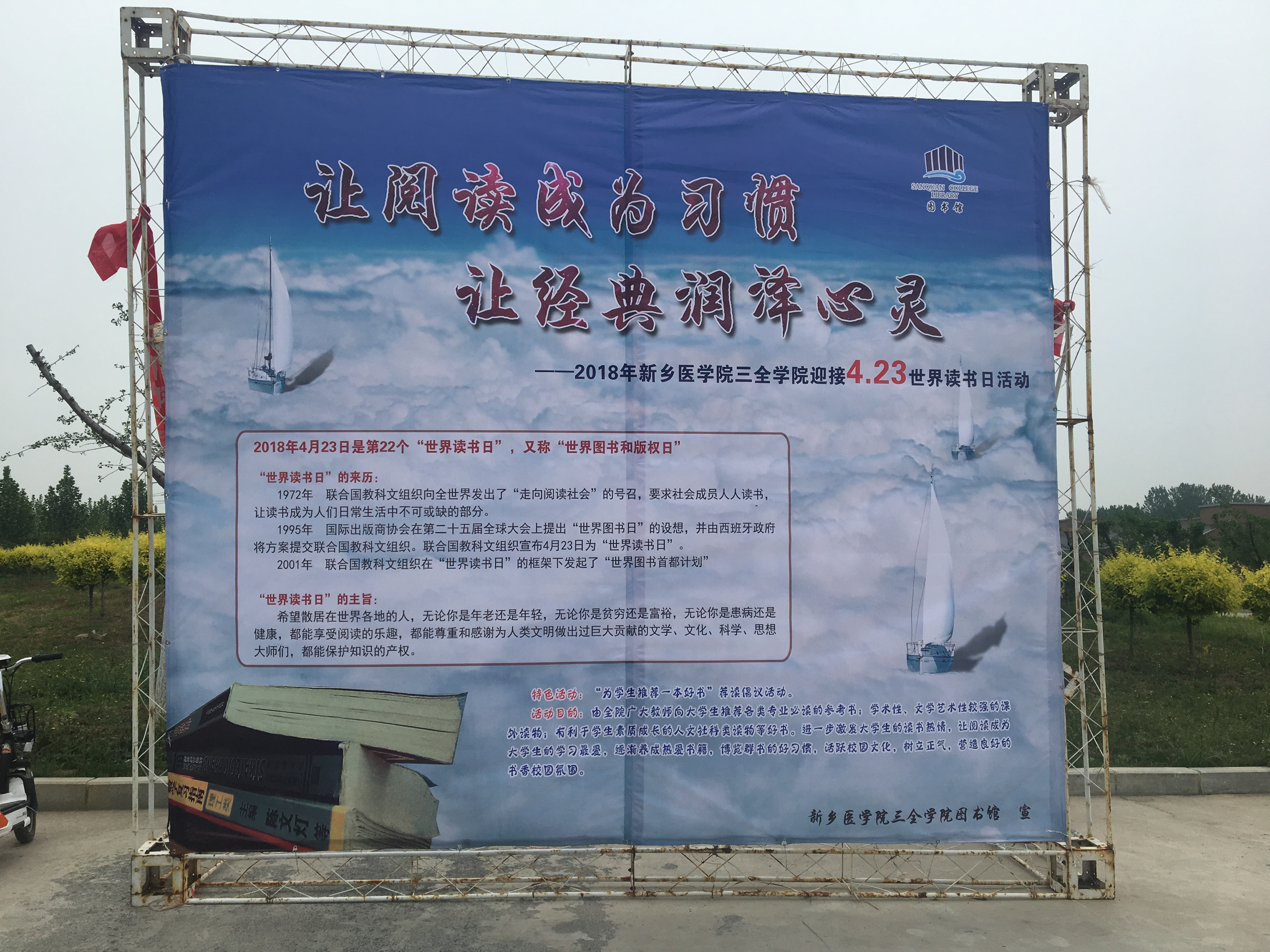 4月23日是联合国教科文组织确定的世界读书日,为了进一步激发大学生的读书热情,树立正确的“价值观”,提高思想觉悟和道德意识,提升大学生的专业学术水平和文学艺术素养。在2018年 “第22届世界读书日”来临之际,新乡医学院三全学院图书馆举办了 “让读书成为习惯,让经典润泽心灵”为主题的“4.23世界读书日”宣传活动,活动以“教师为学生推荐一本好书”倡议为中心,在全校教师中发放了“教师为学生推荐一本好书”倡议书,动员教师参与读书育人,引导学生多读专业性强、文化艺术水平高的好书。活动还开展了宣传推介河南省高校图书情报委员会号召推广的“河南省大学生阅读推荐书目”,与校学生会合办推荐一本“最喜欢或最近看过的一本好书”活动等。