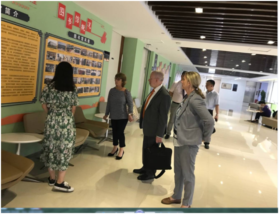 2018年6月26日上午,英国兰开夏大学健康与福利学院院长、英国西北卫生院院长会议主席、卫生部院长执行委员会成员Nigel Harrison,社区卫生与助产系主任、英国高等教育院士Debbie Kenny,国际事务经理 Jackie Day Garner,兰开夏大学中国区负责人葛继飞以及中国陶行知研究会国际合作部主任化红雨在我校外事部主任樊永兵的陪同下,前来图书馆参观。 读者服务部张婕老师和三位外语讲解员带领外宾参观。讲解员全程用英语,为远道而来的朋友分别介绍了图书馆设计理念、功能布局、馆藏文献资源及分布、读者规章制度、各种现代信息化服务设备、服务项目内容等等,演示了研修室、多媒体放映厅、艺术欣赏厅和素质培训室等功能设备的使用,并对外宾们的提问进行了逐一的回答,给外国友人留下了清晰全面的图书馆印象。 此次参观活动,不仅搭建了一个与国外校友良好地学习交流的平台,同时也扩大了我校图书馆的知名度。