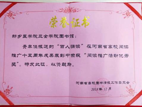 百人诵读获嘉奖 “百人诵读”作为三全学院的特色活动,一年一度的雕磨将它一次次重生,它是革命精神的载体,时代的巨轮滚滚前行,它却将步履变缓,带领大家缅怀革命先烈,弘扬爱国情怀。故“百人诵读”在河南省高校阅读推广十五周年成果表彰中荣获“阅读推广活动优秀奖”。“百人诵读”是我校图书馆的代表活动,在“百人诵读”活动取得佳绩的同时,图书馆更是因此增光溢彩。