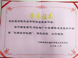 优秀个体被褒奖 “火车跑得快,全靠车头带”。图书馆一系列的优秀活动的顺利开展离不开各位成员的团结配合、默契合作,更不离开优秀的带领人、号召者。图书馆副馆长张帆,将阅读的热爱倾注在这些优秀活动中。活动开展前,张馆长时刻关注;活动过程中,张馆长有序指导;活动结束时,张馆长总结经验。新春伊始,张帆副馆长在河南省高校阅读推广十五周年成果表彰中荣获“优秀阅读推广人”。此外,作为阅读推广的另一优秀组织,“读者服务协会”也务实工作,在河南省高校阅读推广十五周年成果表彰中荣获“优秀读书社团”的称号。