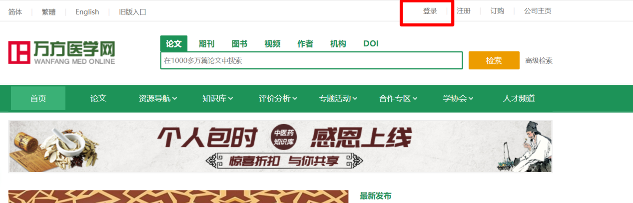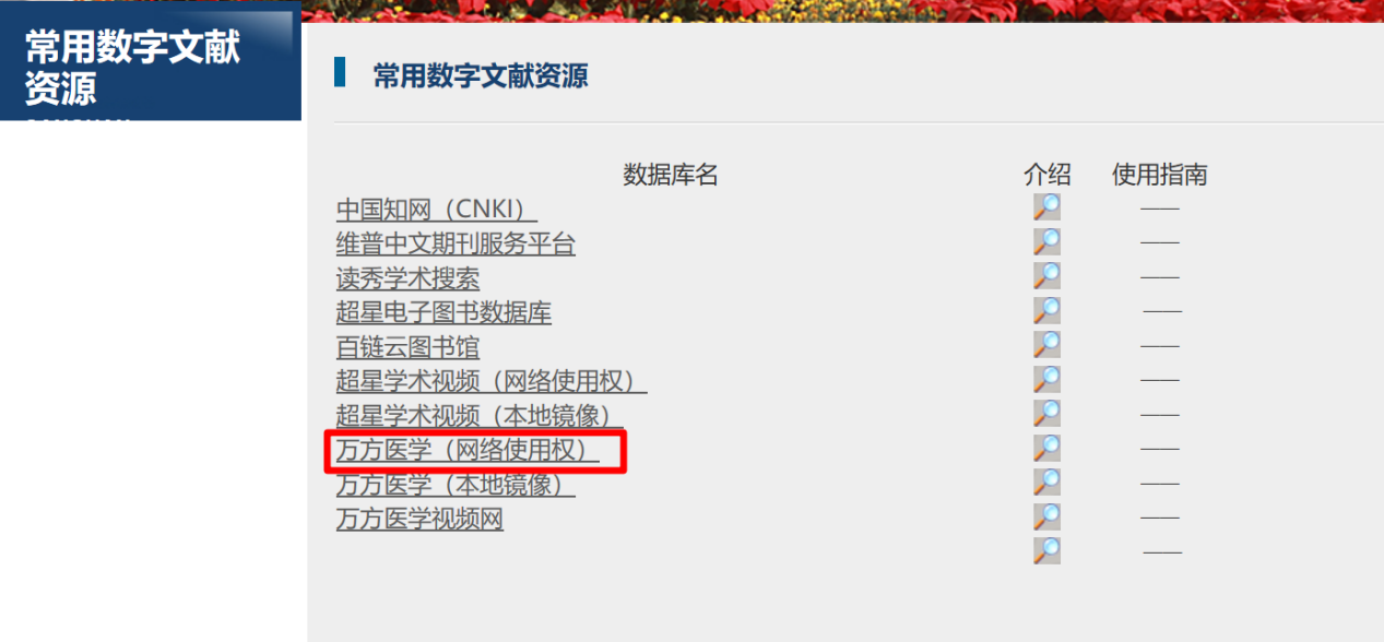 二、万方数据知识资源云服务系统V1.0 1.输入网址链接:http://med.wanfangdata.com.cn/或在校图书馆网站常用数字文献资源链接处点击万方医学(网络使用权)(如图1)进入万方医学网主页: