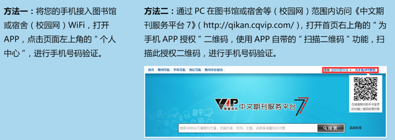 为方便学校师生使用图书馆数据库资源,解决校外访问问题,图书馆分别与商家协商开通校外使用权限,其中包括维普中文期刊服务平台、万方数据知识资源云服务系统V1.0、中国知网、读秀知识库、本地PubMed检索平台,特将校内外使用方法作以下说明: 数据库校内访问途径: 登陆图书馆主页,点击左下角”资源”栏目,通过“常用数字文献资源”(本地Pubmed为“试用数据库”)进入所需数据库平台 数据库校外访问途径: 一、维普中文期刊服务平台 校外访问维普中文期刊服务平台7.0,有两种方式: 1.移动端 APP:通过手机APP,在手机上访问 步骤1、各大应用市场下载或者扫码下载