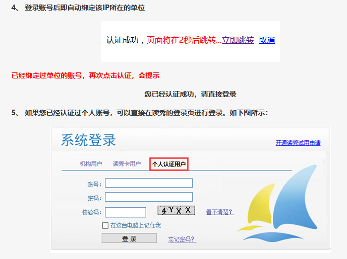 四、读秀学术搜索数据库 1.电脑端互联网访问 (1)任一可访问互联网的电脑浏览器打开读秀学术搜索网站,网址为www.duxiu.com,或者通过学校官网-职能部门-图书馆-常用数字文献资源-读秀进入读秀学术搜索网站。如下图:在校园IP内先通过个人认证流程后,即可在校外登录个人注册的个人认证账号登录。具体程序如下截图:输入读秀网址:www.duxiu.com点击页面右下角弹出的个人认证框: