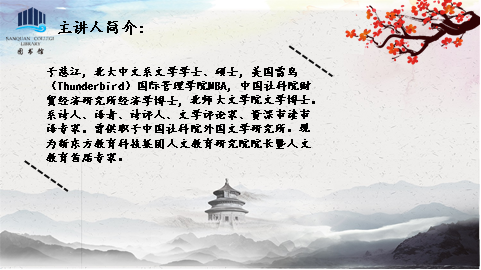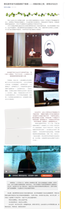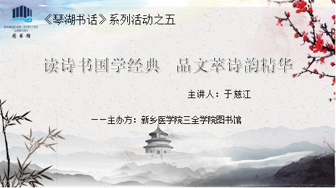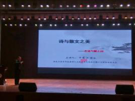 2018年5月17日晚,由我院图书馆举办、图书馆学生管理委员会承办的第五期《琴湖书话》之“读诗书国学经典、品文萃诗韵精华”活动在闻德礼堂圆满落幕。此次活动邀请著名文学家于慈江教授,于教授以其卓越的文学知识和独到见解为同学们带来了一场精彩的诗歌、散文盛宴,他用声情并茂的朗诵解读诗歌散文的意蕴、感情和思想,帮助医科学生如何欣赏、朗诵诗歌、散文。 在庄严的国歌中,第五期琴湖书话活动缓缓拉开了序幕。伊始,由图书馆华玉民馆长上台致辞,并介绍于慈江教授的丰富经历,并热烈欢迎于慈江教授为大家演讲。 本次活动共分为三个环节,依次为发表演讲、访谈互动、朗诵环节。 于教授强调到本科学习生活的重要性,他亲切地说自己尤其喜欢与本科生交流。他讲到大家作为医学生应该值得被尊敬,大家应该充满自豪感,他的幽默而富有激情的演讲,不断将活动推向高潮,激起台下观众的阵阵掌声。当谈到“工匠精神”的诠释,于教授说“工匠精神”追求完美,追求高的品质,要求大家对待每一件事情都要全力以赴。于教授带领大家回顾了庞德的诗—《在地铁车站》,一品诗之朦胧;接着品赏了杨绛先生的《我与世人一向无争》,二品文之清雅;随后,于教授以一篇诗朗诵史铁生的《秋天的怀念》深深抓住了在座观众的心,他对母爱细腻的讴歌,令人感触颇深,同时也使在座观众深深陷入了诗与散文的魅力之中。 在访谈环节,主持人代表全体学生向于教授提出问题,于教授认真回答了多个问题,并做了独到的分析,他的这些话使在座同学受益匪浅,赢得全场热烈的掌声。 在激动人心的朗诵环节,于教授播放了《致橡树》和《你是人间四月天》的朗诵音频,并做了细致的点评。最后于教授的一首《再别康桥》诗歌朗诵感情真挚、浓郁、隽永,再次将现场气氛推向高潮,同学们深深沉浸在朗诵中感受康桥流水的柔美。在朗诵后,于教授以“同学们珍惜年轻时光,努力学习,只争朝夕”作为结束语,对广大学子提出希冀和建议。 活动最后,工作人员与于教授合影留念,本次活动圆满落幕。此次活动激发了同学们的阅读热情,为我们打开诗歌、散文的天窗,对领略欣赏文萃诗韵精华有极大帮助。