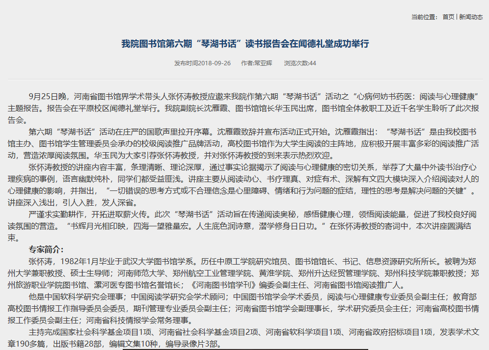 《琴湖书话》第六期:河南著名图书馆学家张怀涛教授—“心病何妨书药医:阅读与心理健康”读书报告