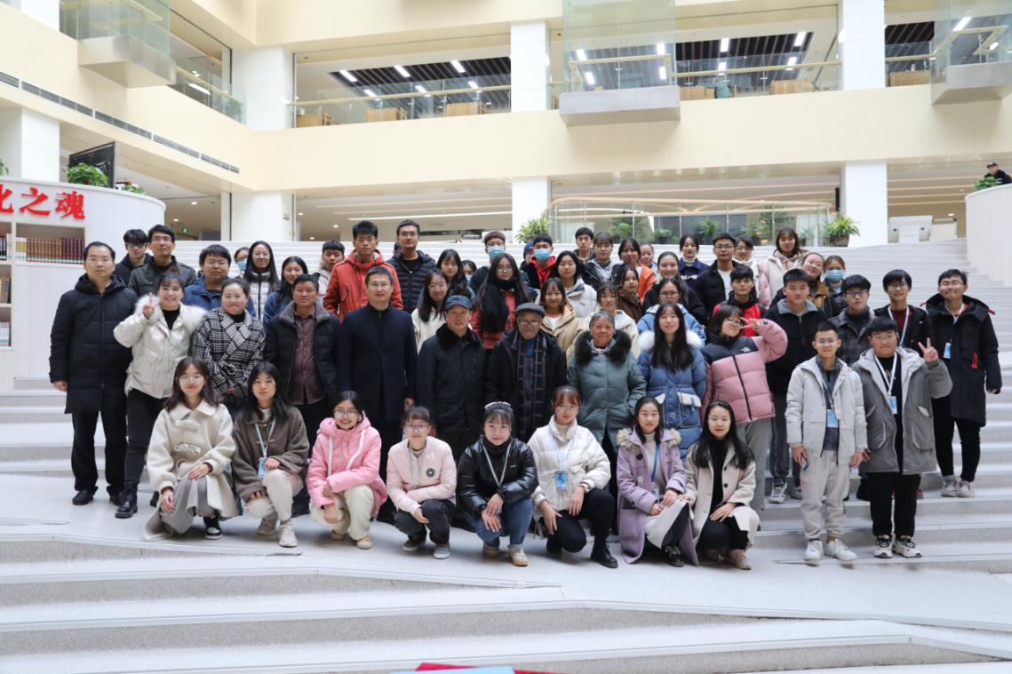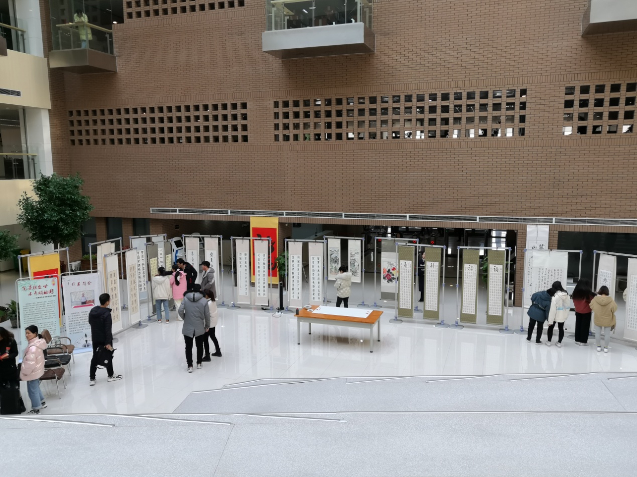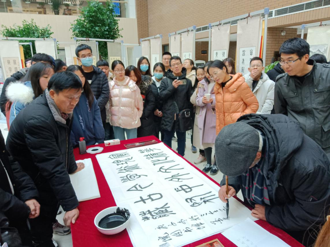 12月10日起,图书馆在一楼中庭举办了以“笔墨绘盛世,丹青颂祖国”为主题的《张增友书画作品欣赏展》,共展出张增友先生书法作品49幅,绘画作品6幅。书法作品涵盖篆、隶、楷、草诸体,表现形式多样,展现了张增友先生精深的书画艺术造诣,也为师生提供了一个观赏中国传统书画艺术的机会。书画展期间,12月18日下午,图书馆举办了第十三期《琴湖书话》书画艺术报告会,特邀河南省书法家协会张增友先生为广大师生讲授传统书画艺术的精髓与技法。我校副院长薛宏、图书馆馆长华玉民出席,图书馆各部门老师、书法协会代表及百余名三全学子参与此次活动。 报告会在图书馆馆长华玉民的精彩致辞下正式拉开帷幕。他首先向到场师生引荐此次主讲嘉宾张增友先生,表示对张老先生的热烈欢迎,他指出:书画艺术是中国五千年文明及璀璨文化的结晶,可以陶怡情操、增长涵养,使人知美丑、懂古今、昂视苍穹。同时,希望通过此次活动能更好地弘扬中国传统文化,引领三全师生感受中国书画艺术的独特魅力。 接下来进行嘉宾分享环节。张增友老先生向同学们分享了自己对中国传统书画艺术的认识和习作体会,正是中国文字书法与泼墨造物的独特艺术魅力,引领自己少时痴迷书法和丹青绘画,废寝忘食不分昼夜练习。随后,张老先生就展出的个人书画作品,讲解了其文字内容、字体特征、书画技法及创作意图。分享完毕后的现场互动环节,同学们争先恐后,踊跃提问。张老先生悉心解答同学们关于如何欣赏书画艺术,怎样学习书法等疑问,现场氛围热烈,同学们受益匪浅。 精彩的交流互动结束之后,应图书馆和同学们的请求,张老先生现场即兴泼墨创作,为图书馆写下“藏古今学术瑰宝,聚中外文化精华”、“图书馆”等书法作品,深刻表达了图书馆作为知识殿堂的文化底蕴。同时,张老先生还现场创作书法作品20余幅,分送给求字的同学,激励三全学子热爱中国传统书画艺术,努力学习并传承中华文化。 最后,全体与会人员合影留念,共同见证本期《琴湖书话》活动圆满收官。 本次《琴湖书话》活动通过名家“书画展”与书画艺术报告会的形式,让三全学子直接观赏中国传统书画艺术和书画艺术创作过程,对于青年学子领略中国传统书画艺术的风采,感受中国传统文化的艺术魅力,提升书画艺术素养和鉴赏能力,落实学校“三个全面育人”的办学理念,促进校园文化建设具有重要意义。