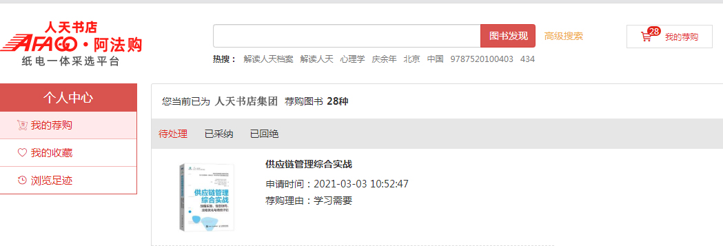 (四)我的荐购:【个人中心】→【我的荐购】 中可查看到所有的荐购书目,及图书馆的采纳情况。