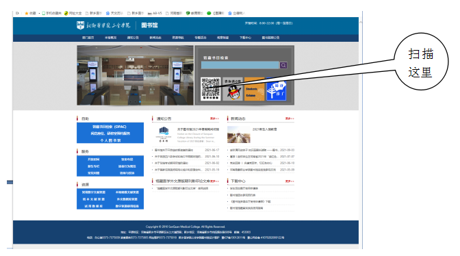 为了解决新乡校区读者借阅图书的困难,图书馆于2018年10月在新乡校区综合楼一楼建立 “图书借还处”,2019年因学校微信公众号暂停使用,读者无法网上预约借书而暂停服务。学校微信公众号现已恢复使用,图书馆拟于2021年10月15日起,恢复读者预约借阅图书的服务。 1、图书馆借还处开放时间: 每周三<晚上18:30-20:00>、 每周四<中午12:30-13:30,晚上18:30-20:00 > 2、具体借阅流程及注意事项如下: (1)需要借阅图书的读者,先登录图书馆网站,在网站上扫描图书馆官方微信公众号“馆学长微咖”二维码,登录注册,绑定个人账号,然后在“馆藏书目检索(OPAC)”中查找检索你所想要借阅的图书,并对所需借阅的图书进行“预约”操作。