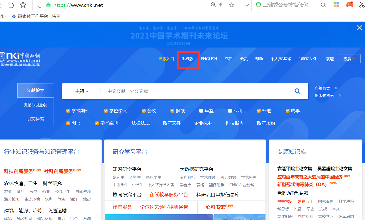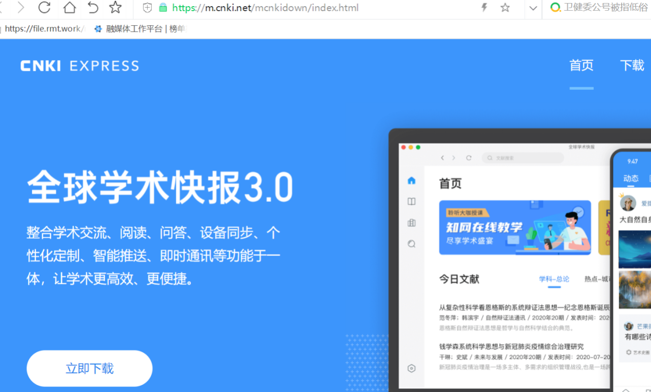 2.手机端app访问 (1)中国知网CNKI数据库手机端app名称为“全球学术快报”,(请注意,不要下载手机知网,手机知网需要另外收费使用),可直接在手机应用商店或应用市场搜索“全球学术快报”下载安装app,或者电脑端打开中国知网,点击左上侧的“手机版”,扫描二维码下载。如下图: