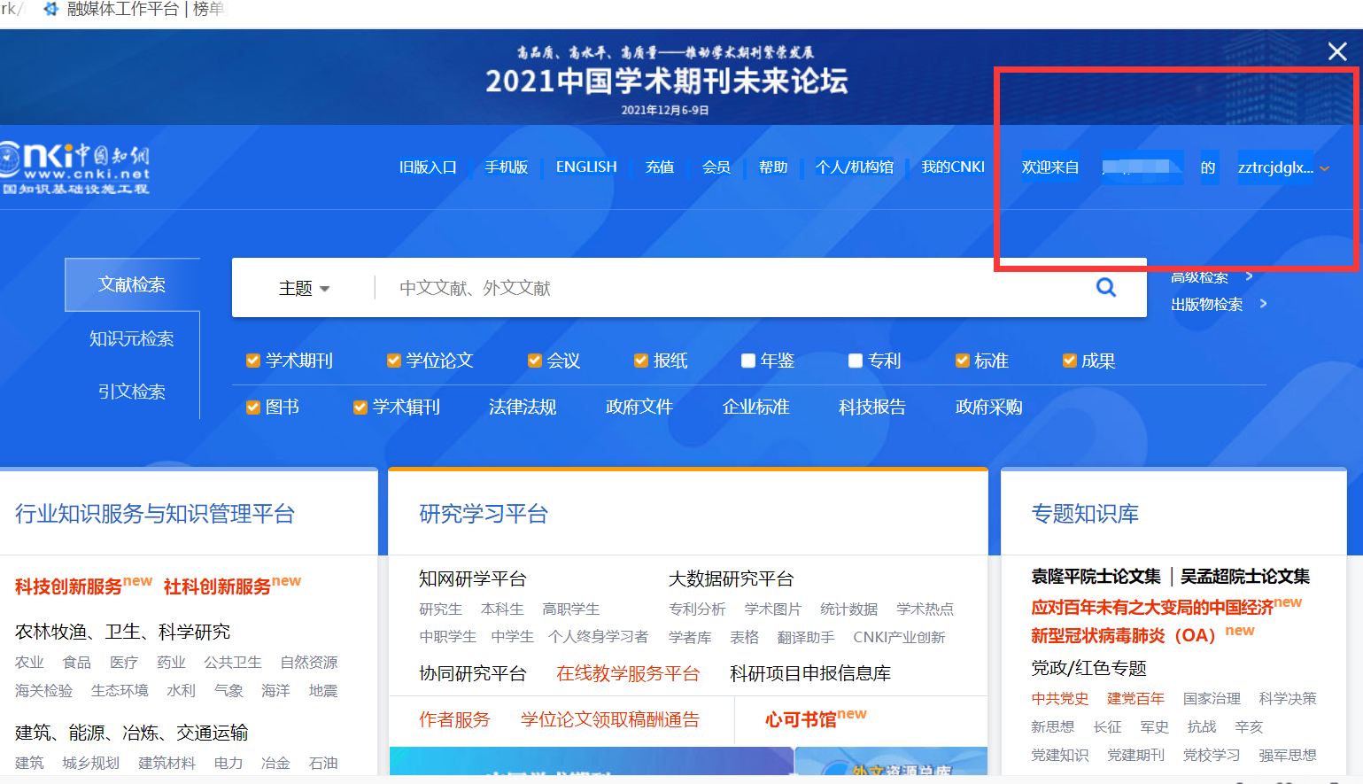 (3)页面自动跳转到登录后的首页界面,即可检索下载使用,如系统提示当前并发已满,这是由于此账号有其他人在使用,可换其他漫游账号或过一段时间使用。如下图: