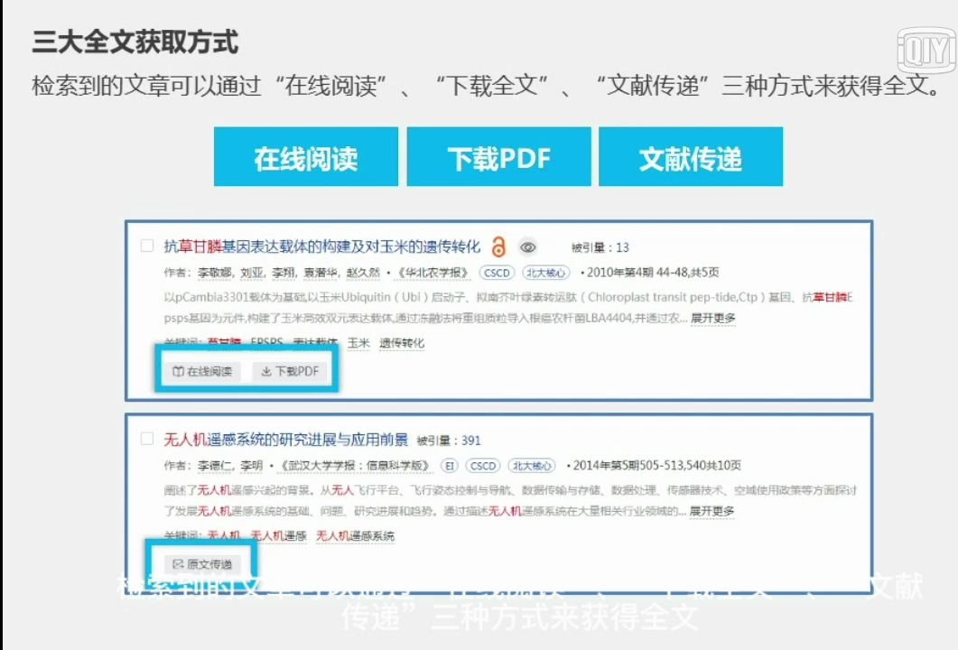 1. 检索到的文章可通过在线阅读、下载全文、文献传递三种方式获取全文。
