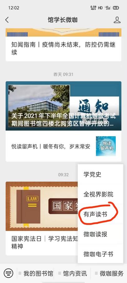 1.微信搜索并关注图书馆微信公众号“馆学长微咖”,点击右下角“微咖服务”—“有声读书”进入主页