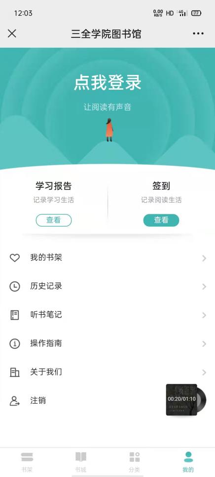 2.首次进入需点击主页右下角“我的图书馆”,进行微信授权即可对书籍进行搜藏、断点播放、加入书架、写听书笔记等功能。