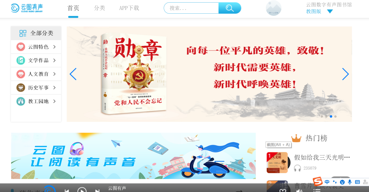1.PC端登陆图书馆主页,点击左下角”资源”栏目,通过“常用数字文献资源”进入云图数字有声图书馆主页。