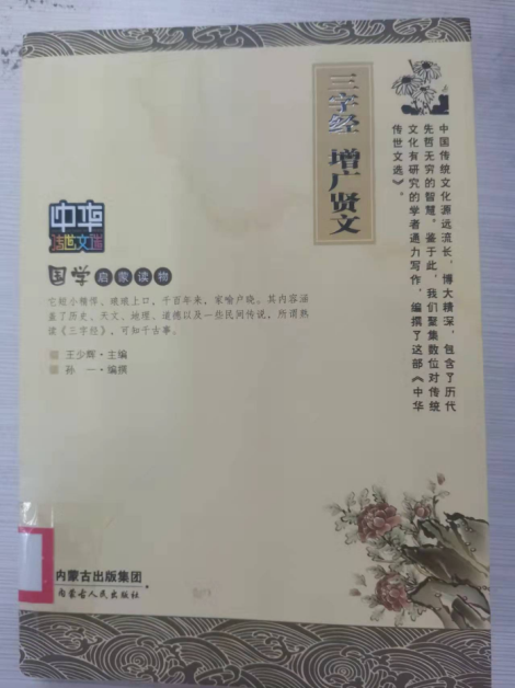 推荐书名: 《三字经增广贤文》 出版社:内蒙古人民出版社 图书ISBN:9787204108121 馆藏索书号:H194.1/W332 推荐理由: 中华传统文化源远流长,博大精深,包含了历代先哲无穷的智慧。正因如此,这部《中华传世文选》便由数位对传统文化有研究的学者通力写作,编撰而成。它短小精悍,琅琅上口,千百年来,家喻户晓。其内容涵盖了历史、天文、地理、道德以及一些民间传说,所谓熟读《三字经》,可知千古事。 读书感言: 古有云:“以铜为镜,可以正衣冠;以史为镜,可以知兴替;以人为镜,可以明得失。”本书所蕴含的仁、义、礼、智、信等中华优秀传统文化都是如今我们文化自信的来源。也正是其中所包含的先贤的智慧,形成了我们如今看待世界的根本。熟读此书,深刻领略古人的礼义智慧,想必必有所得。 推荐人:郭云鹏·图书馆