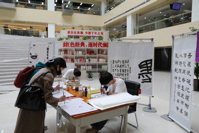 4月11日-25日的“翰墨书香”书法体验活动,以“感受书法之美,尽享读书之乐”为主题,以弘扬中华悠久书法文化为主要内容,参与者可现场向书法协会成员学习书写技巧并体验,也可按照图书馆提供的字帖和国学经典临摹,充分感受厚重的书法文化和文字之美。