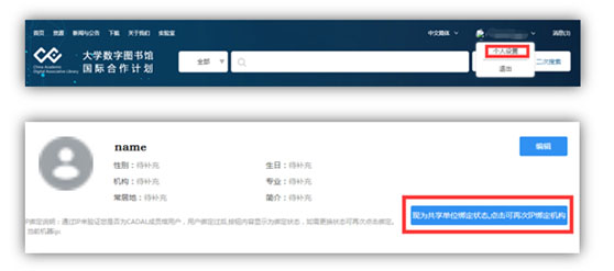 注意:如出现CADAL权限资源无法访问问题 (1)确认用户IP是否在授权IP范围之内(校内IP范围可用)。 (2)确认是否IP绑定成功。用户将鼠标放置“个人账号”点击“个人设置”。查看是否为共享单位绑定状态;若未绑定成功,点击可再次IP绑定机构。