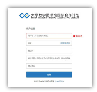 2.如何IP绑定机构? 新注册用户首次登录,系统将提示机构认证,点击链接可跳转至[个人设置]页面[IP绑定机构],按引导提示操作即可。 用户机构认证规则分设[有效期]、[禁止变更期]、[缓冲期]: 用户首次认证机构后,即开始180天有效期,在认证机构IP范围内登录将自动刷新期限。 同时,用户如修改认证机构,则进入90天禁止变更期,期间冻结认证操作。 若有效期内从未在认证机构IP登录过,则逾期后进入30天缓冲期,且系统将在登录时提示,缓冲期内重新认证机构后即再次转为有效期,否则用户角色将归为社会公众。 3.注册登录 用户点击首页右上角“注册/登录”按钮,进入到CADAL注册页面,填写用户名、验证码等相关内容,即可注册成功;