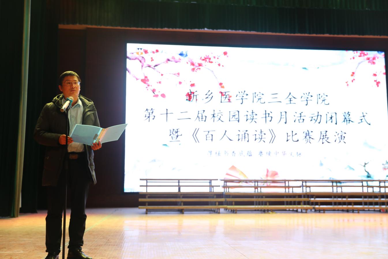 为积极响应习近平总书记在文化传承座谈会上的讲话精神,鼓励青年学子担当起推动文化繁荣、建设文化强国、建设中华民族现代文明的新的文化使命,我校图书馆举办了以“厚植书香底蕴,赓续中华文脉”为主题的第十二届校园读书月系列活动。12月7日晚,第十二届校园读书月活动闭幕式暨《百人诵读》比赛展演在闻德礼堂隆重举行。新乡医学院三全学院副院长薛宏出席,各书院、院(系、部)、相关职能部门负责人、教师代表及千余名学生参加了此次活动。