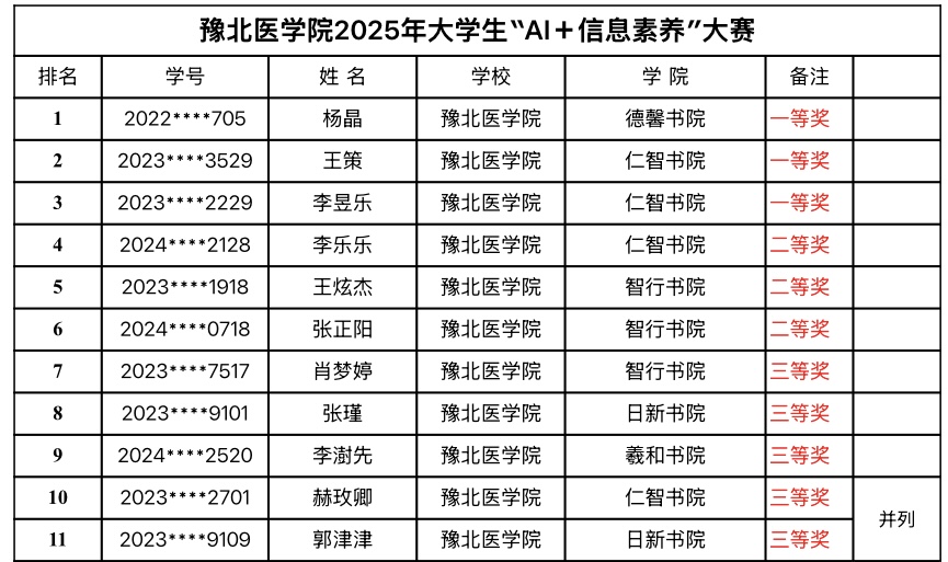 智汇AI展锋芒,信息素养筑新章。豫北医学院2025年大学生“AI+信息素养”大赛已圆满结束。此次活动中,我校同学踊跃参与,展现了扎实卓越的知识素养。现将获奖名单公布如下,获奖者请于2025年10月12日至10月15日,到图书馆二楼东服务台领取获奖证书。