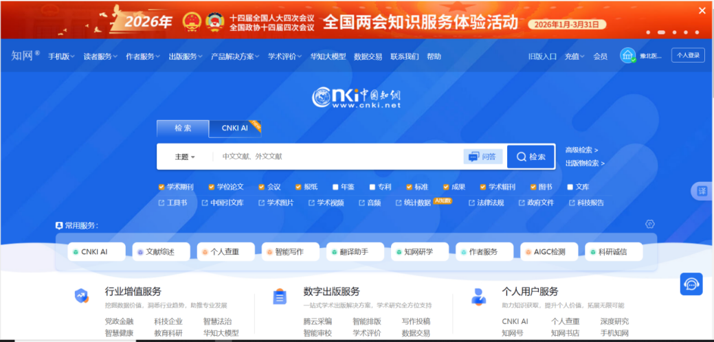 3.登录成功后,右上角显示学校名称,即可对中国知网的文献资源进行在线检索、浏览、下载等操作。
