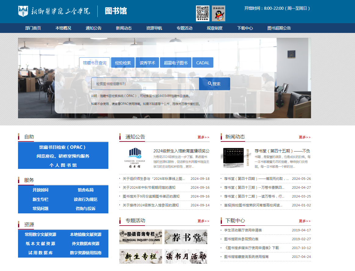 To make an online reservation, please log on the website of Sanquan College Library, http://lib.sqmc.edu.cn/, and click on "Study Room Reservation Service".