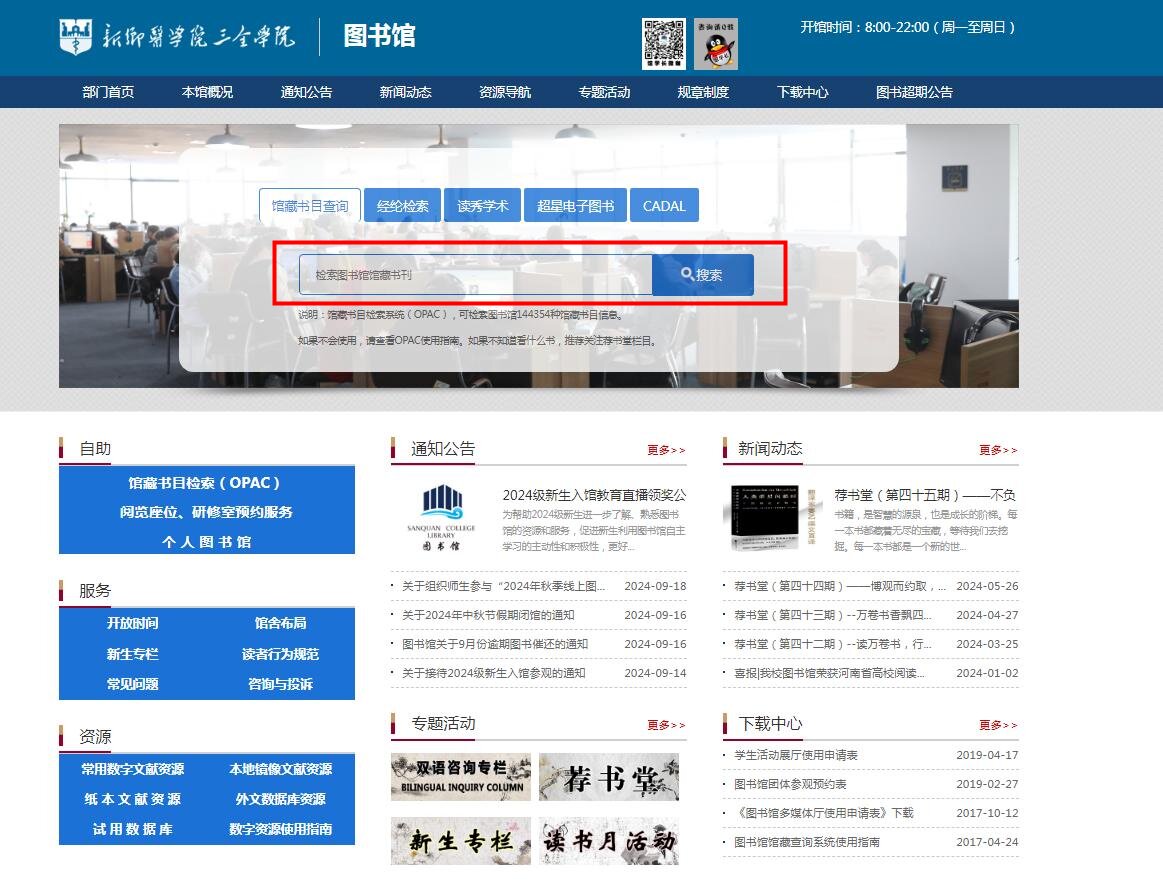 5、如何查找馆藏纸质文献资源? 5. How to find the paper literature resources in the collection? 答:通过图书馆网站或图书馆馆藏目录检索系统(OPAC)查阅, OPAC又常称为联机公共目录系统,是读者查找馆藏的检索工具。本校读者可以在OPAC中进行图书查询、办理续借、查询个人借阅情况等操作。查询方法包括: A: Through the library website or the collection catalog retrieval system (OPAC, which is often referred to as the online public directory system and a search tool for readers to find collections), readers of our school can look for books, apply for renewals, and know about personal borrowing status. The methods include: (1)在图书馆网站首页→自助→馆藏书目检索(OPAC)进行检索操作。 (1)Log in to the homepage of the library's official website → Self-help → Collection of Bibliographic Search.